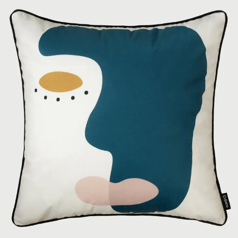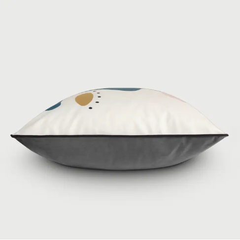 Consisting of a sophisticated colour palette of midnight blue, mustard yellow and dusty pink on a cream backdrop, and finished off with a black edge piping and a grey velvet reverse.