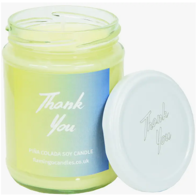 Say it in style with our compliment candles. Pretty lemon wax and yellow and blue ombre label with 'thank you'.