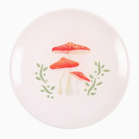 This sweet trinket dish features a delicate illustration of 3 red-spotted mushrooms.