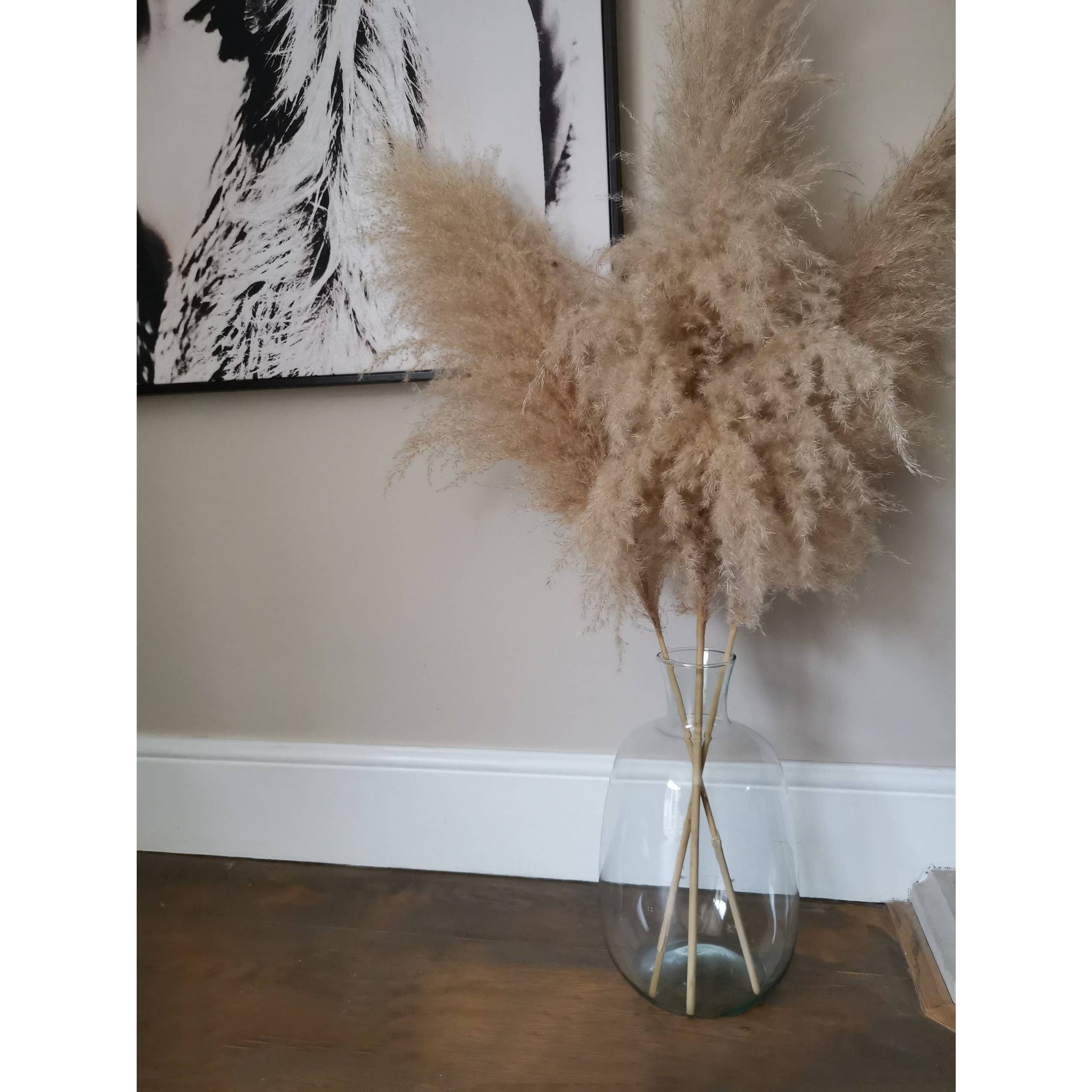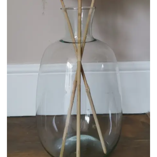 Bottle neck glass vase with a round body, a great vase for your tall pampas grass.