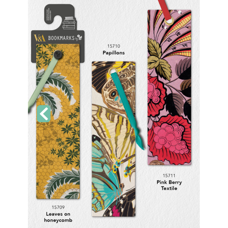 Carefully chosen subject matter to appeal to wide audience. Global license - no territory limitations. Presented on a special foiled V&A version of the bespoke IF cardboard bookmark hanger